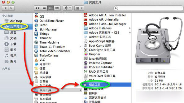 啟動Finder,進入“應用程序” - “實用工具” - 雙擊“磁盤工具”。