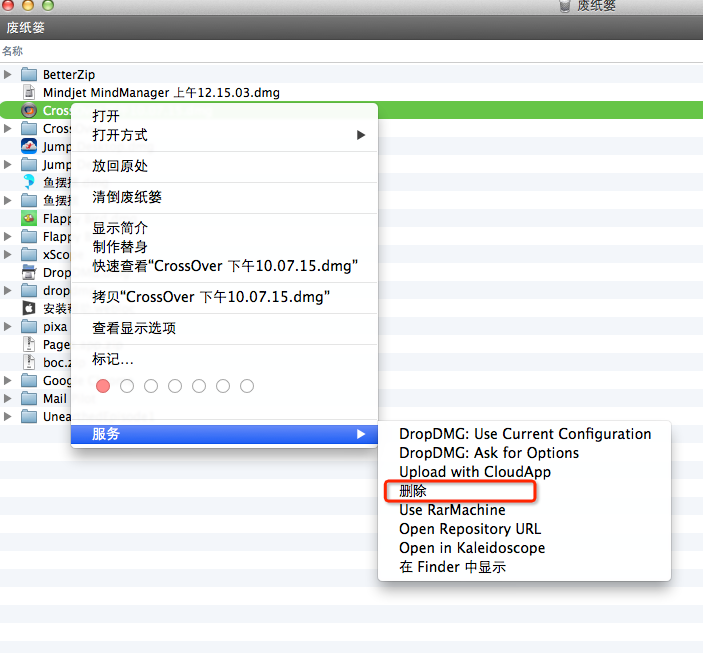 以后,在Finder和廢紙簍右鍵的服務菜單里,可以對文件和文件夾執行這個操作。