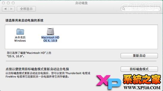 進(jìn)入OS X系統(tǒng)后,在“系統(tǒng)偏好設(shè)置”里找到“啟動(dòng)磁盤”,選擇“Macintosh HD OS X”或者“Windows”,點(diǎn)擊“重新啟動(dòng)”按鈕,就可以設(shè)置下次啟動(dòng)后默認(rèn)進(jìn)入的系統(tǒng)了。
