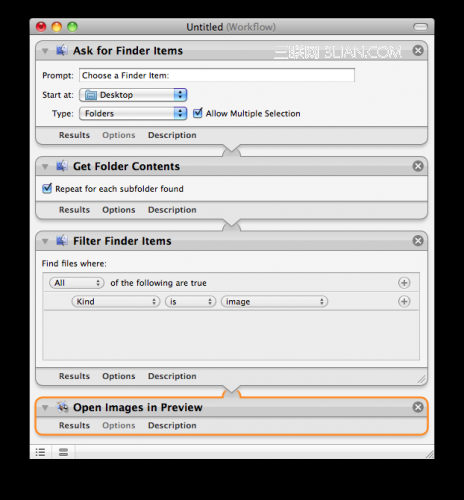 5. 最后拖入一個(gè)Open Images in Preview的動(dòng)作。 最后你就可以執(zhí)行一下看看效果。當(dāng)然你也可以把它保存成.app或者.workflow的格式以便下次再次使用。