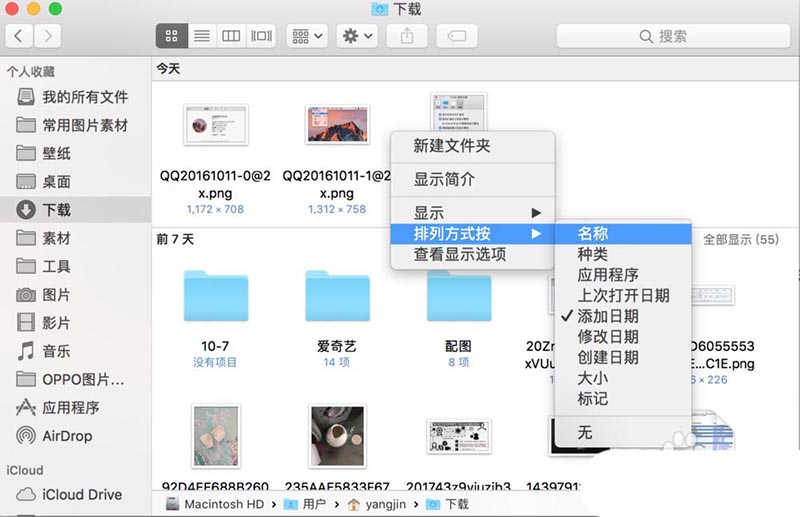5、隨后在 Finder 中選擇一個(gè)目錄,在空白區(qū)域點(diǎn)擊鼠標(biāo)右鍵,然后選擇「排列方式按-名稱」選項(xiàng),如圖所示。