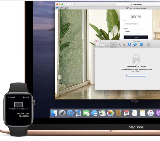 現在你還能用使用Apple Watch批準,連按兩下Apple Watch的側邊按鈕,即可在Mac上完成驗證。可以解鎖加密的備忘錄,確認App安裝,并且無需輸入密碼即可在Safari瀏覽器偏好設置中查看你的各種密碼。