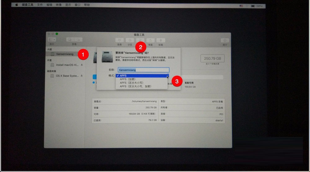 6、在圖一按照一二點擊選擇,在圖二選擇抹掉。這個過程會把Mac上面的所有的數據抹掉,等于格式化。