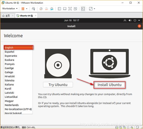3)在彈出的“Welcome”界面中,需選擇所需安裝的系統語言及試用系統(Try Ubuntu)還是安裝系統(Install Ubuntu),此處應該選擇Install Ubuntu,另外,強烈建議語言處選擇English,而不要選擇中文,以免安裝后文件夾名稱中出現中文而在使用過程中不方便命令的輸入;