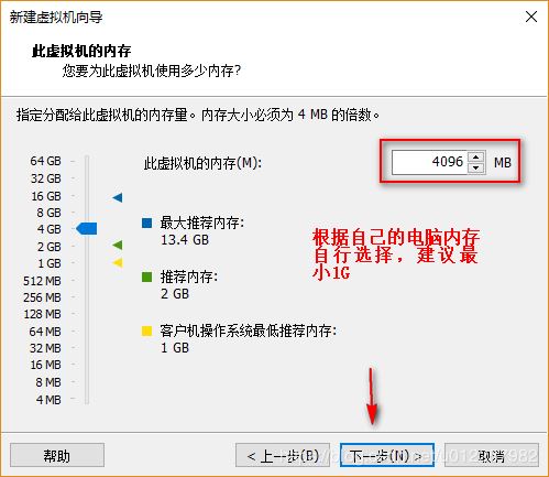 8)在“此虛擬機的內存”配置界面,為該虛擬機指定可用的內存數量,該內存數量與宿主機(原操作系統)所擁有的內存進行共用,可根據機器所擁有的實際物理內存數量進行選擇配置;