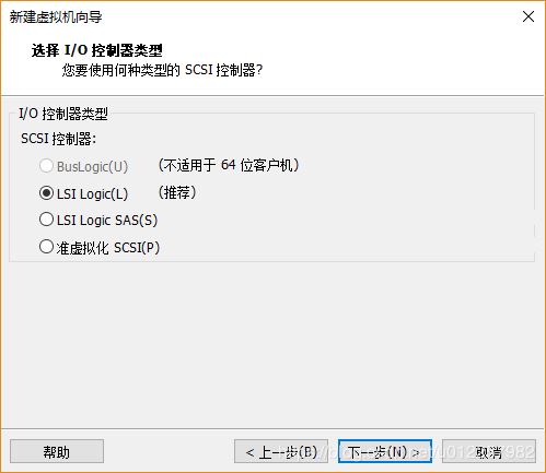 10)在“選擇I/O控制器類型”選項中,可指定虛擬機所使用的I/O控制器類型,該選項將會影響磁盤的IO性能,可選擇LSI Logic和LSI Logic SAS兩個選項,具體各項的含義和區別稍后說明,此處可選擇默認的“LSI Logic”選項;