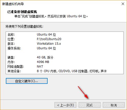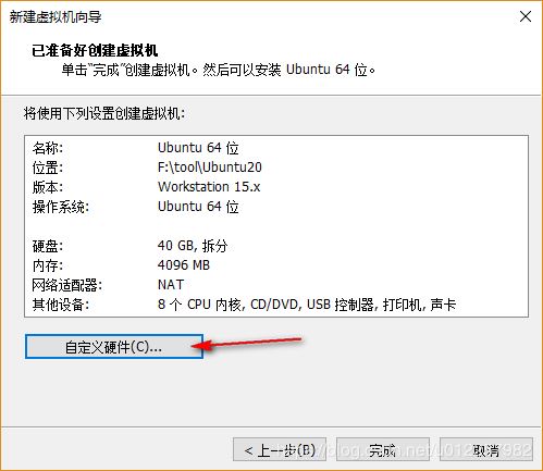 15)在“已準備好創建虛擬機”選項中,會給出前面為該虛擬機所做的所有配置,用于對前面配置的檢查,若發現之前配置出現錯誤,可點擊“自定義硬件”對先前的配置進行更改,另外,在此處可點擊“自定義硬件”,在彈出的選項框中為該虛擬機指定安裝系統時所需要的ISO鏡像文件(在“準備工作”章節所提及的Ubuntu20.04系統ISO鏡像);