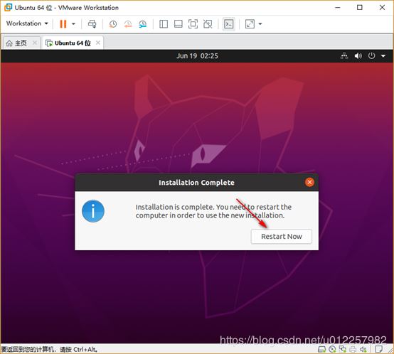11)系統安裝完畢后,會彈出“Installation Complete”對話框,提示系統已經安裝完畢,此時點擊“Restart Now”重啟系統即可進入安裝后的Ubuntu20.04虛擬機系統;