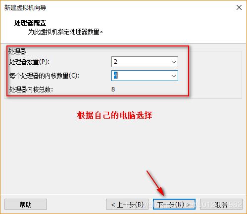 7)在“處理器配置”界面,指定虛擬機的處理器數量及每個處理器的核心數;