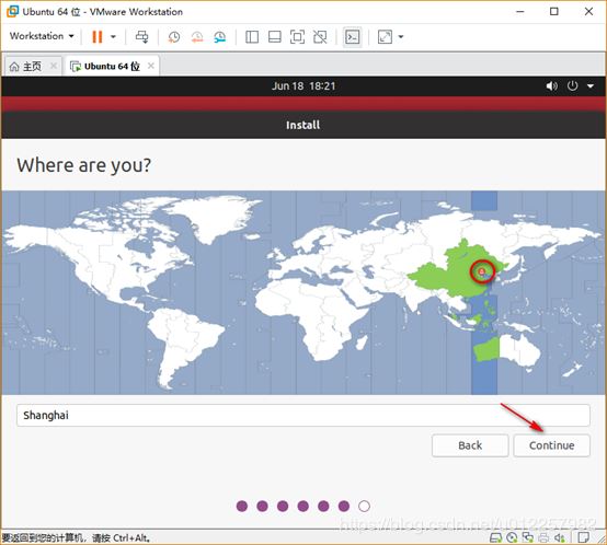 8)在安裝過程中會提示選擇系統所在的時區,以便于系統進行對時操作,在中國國內直接選擇“Shanghai”即可,此處需要鼠標點擊相應位置選擇,點選完畢后點擊Continue繼續下一步;