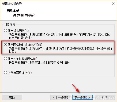 9)在“網絡類型”配置界面,可選擇該虛擬機網卡所擁有的網絡類型,其中包括橋接網絡、NAT網絡、Host Only網絡和不使用網絡,各項網絡的含義及區別稍后會進行說明,此處可選擇默認的“使用”網絡地址轉換(NAT)"一項;