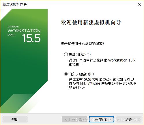 2)在打開的“新建虛擬機向導”中選擇“自定義(高級)”選項,點擊下一步;