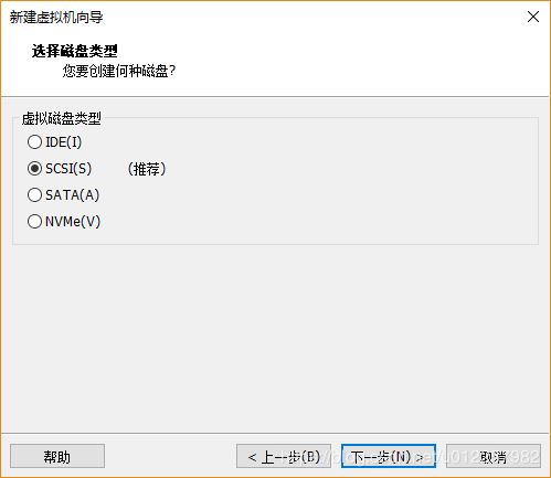 11)在“選擇磁盤類型”選項中,可指定虛擬機所擁有的硬盤的接口類型,一般默認采用推薦的SCSI即可;