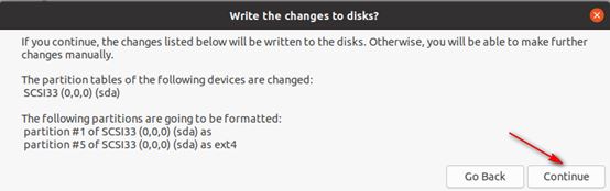 7)在彈出的“Write the changes to disks”選項中,會提示系統默認采用的分區方式,此處直接采用默認,點擊Continue即可;