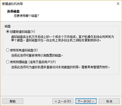 12)在“選擇磁盤”選項中可為虛擬機指定其所使用的硬盤類型,若為新創建的虛擬機,則需選擇“創建新虛擬磁盤”,即表示該虛擬機所用的硬盤為新創建的,不使用以前為其他虛擬機建立的磁盤;