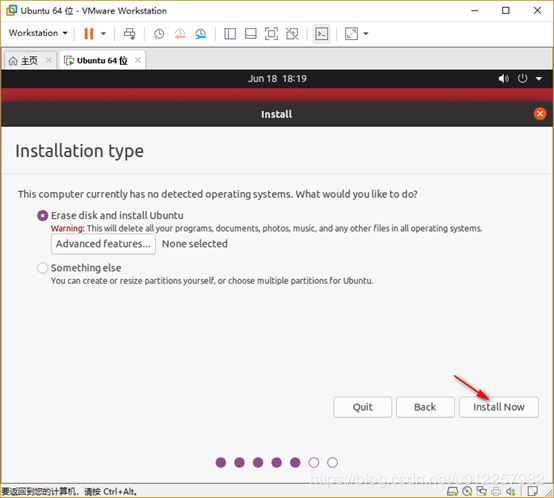 6)在“Installation type”選項中,需指定對硬盤的操作,若是初次安裝,則選擇第一項“Erase disk and install Ubuntu”即可,表示擦除硬盤內容,安裝Ubuntu系統;
