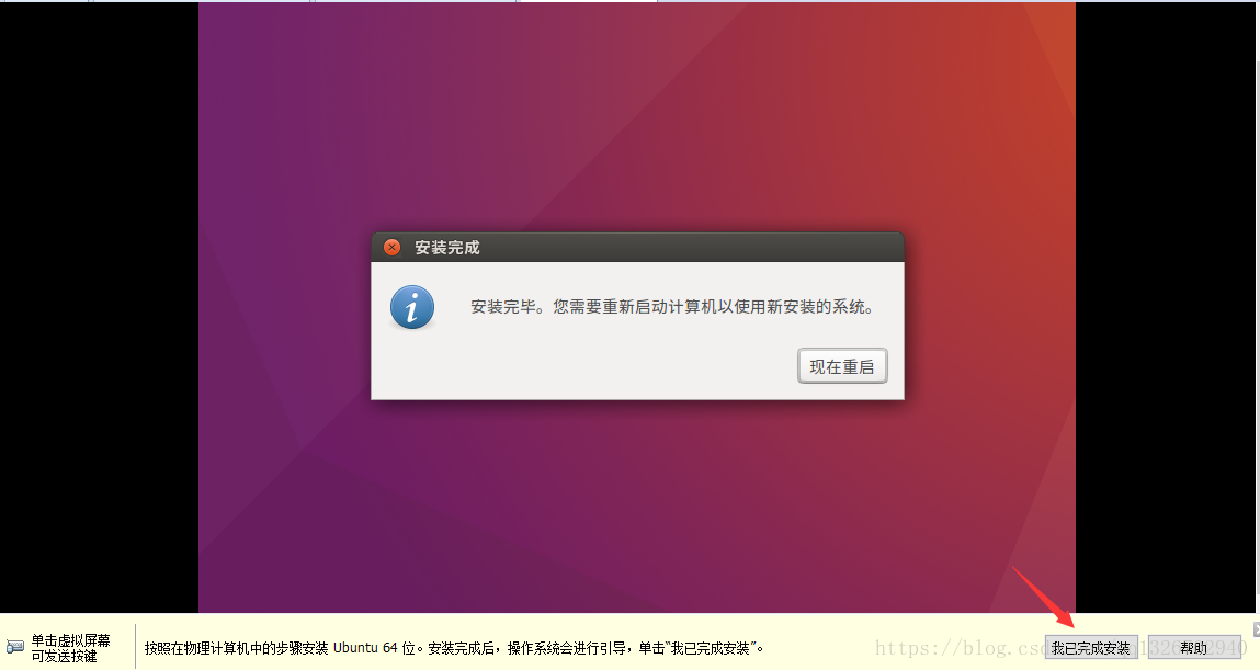 2.26)虛擬機 安裝 完Ubuntu ,需要重啟,先 點擊 虛擬機下面 我已完成安裝