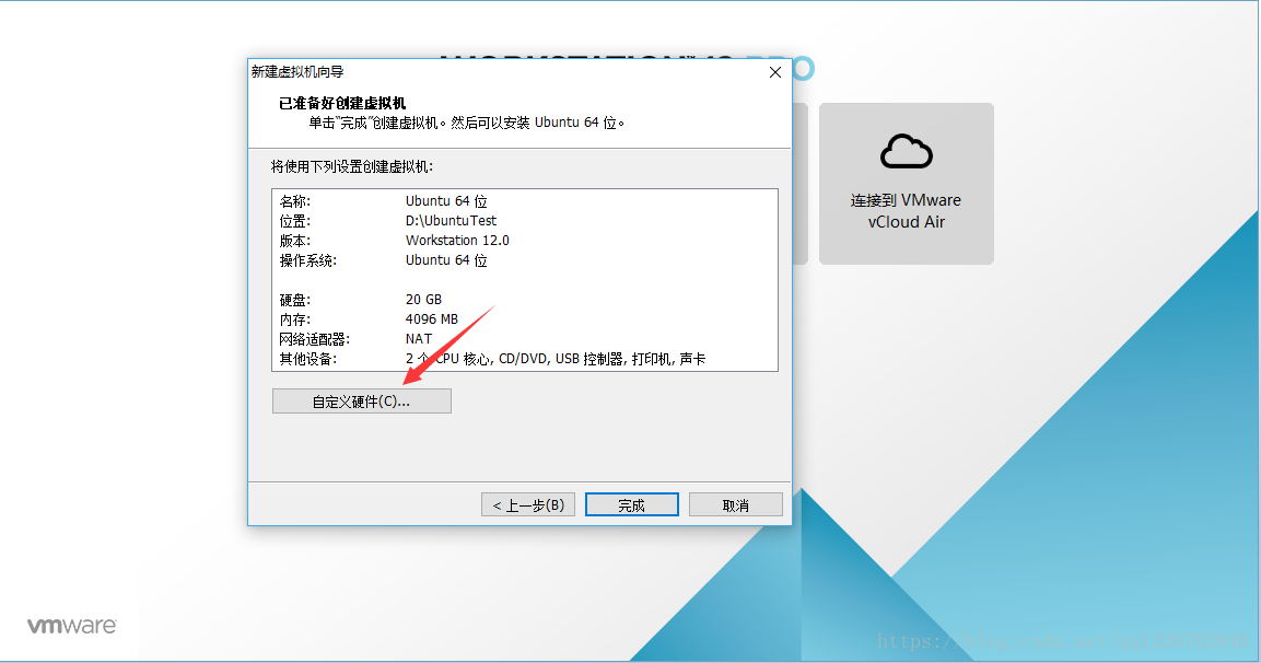2.14)這里 點擊 自定義硬件 按鈕,因為在步驟2.3的時候 選擇安裝來源 的時候,我們選擇了 稍后安裝操作系統,所以在這里我們會選擇系統鏡像的路徑