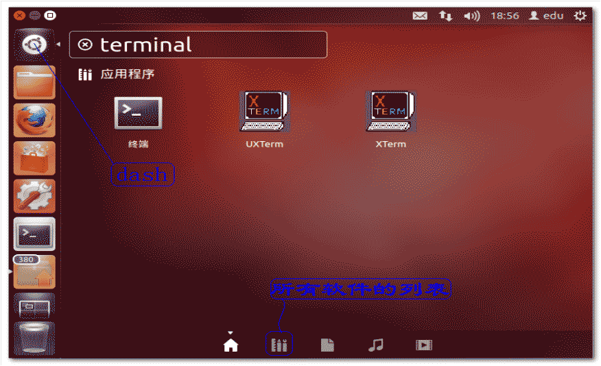 如果我們要打開終端,直接在dash中輸入"terminal"或“終端”即可找到對應的軟件,單擊即可啟動。