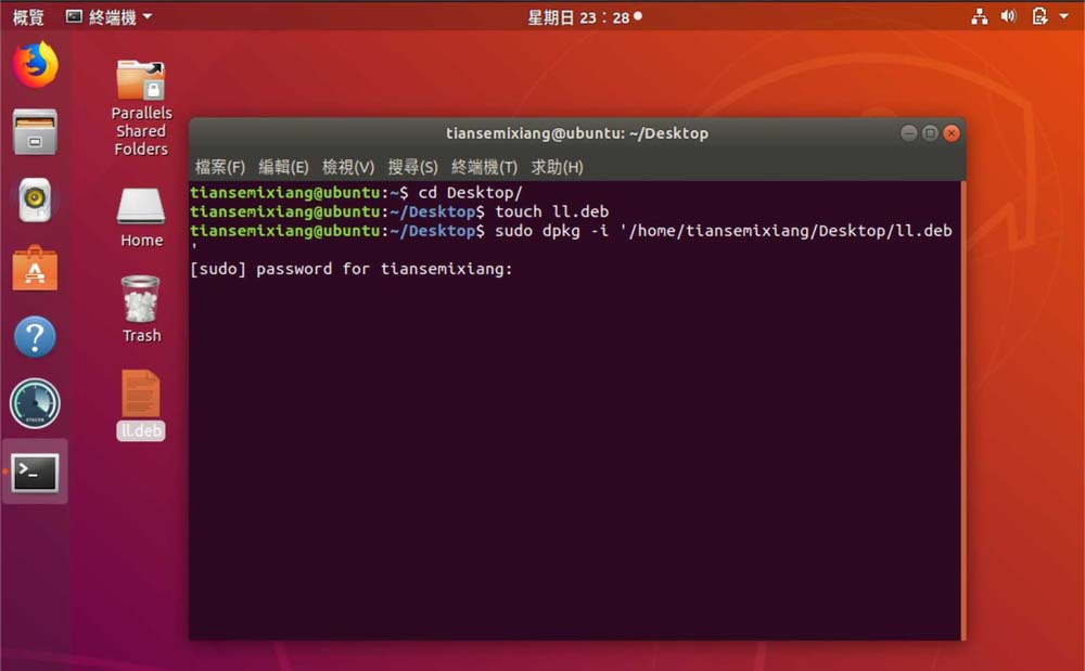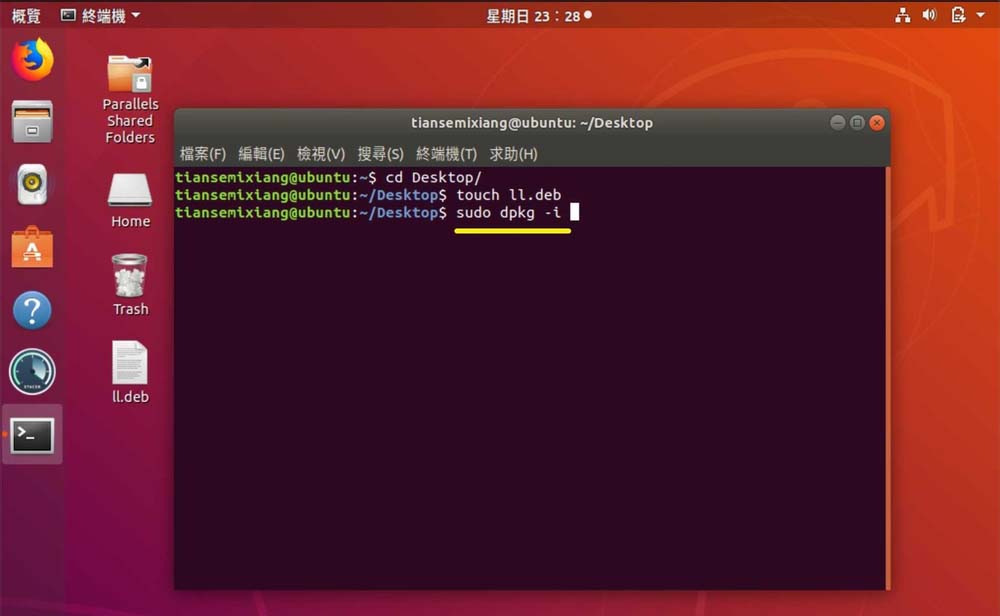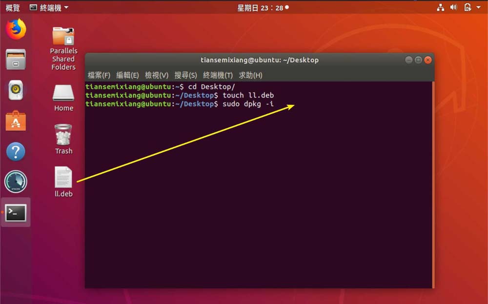 5、把deb拖入【sudo dpkg -i】后面,如圖。
