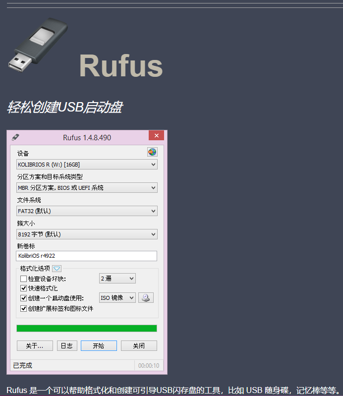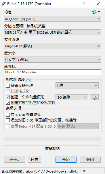 打開Rufus,選擇U盤,選擇上面下載的Ubuntu 17.10鏡像(注意先備份U盤內的重要數據,本步驟會格式化U盤),點擊開始等待寫入成功