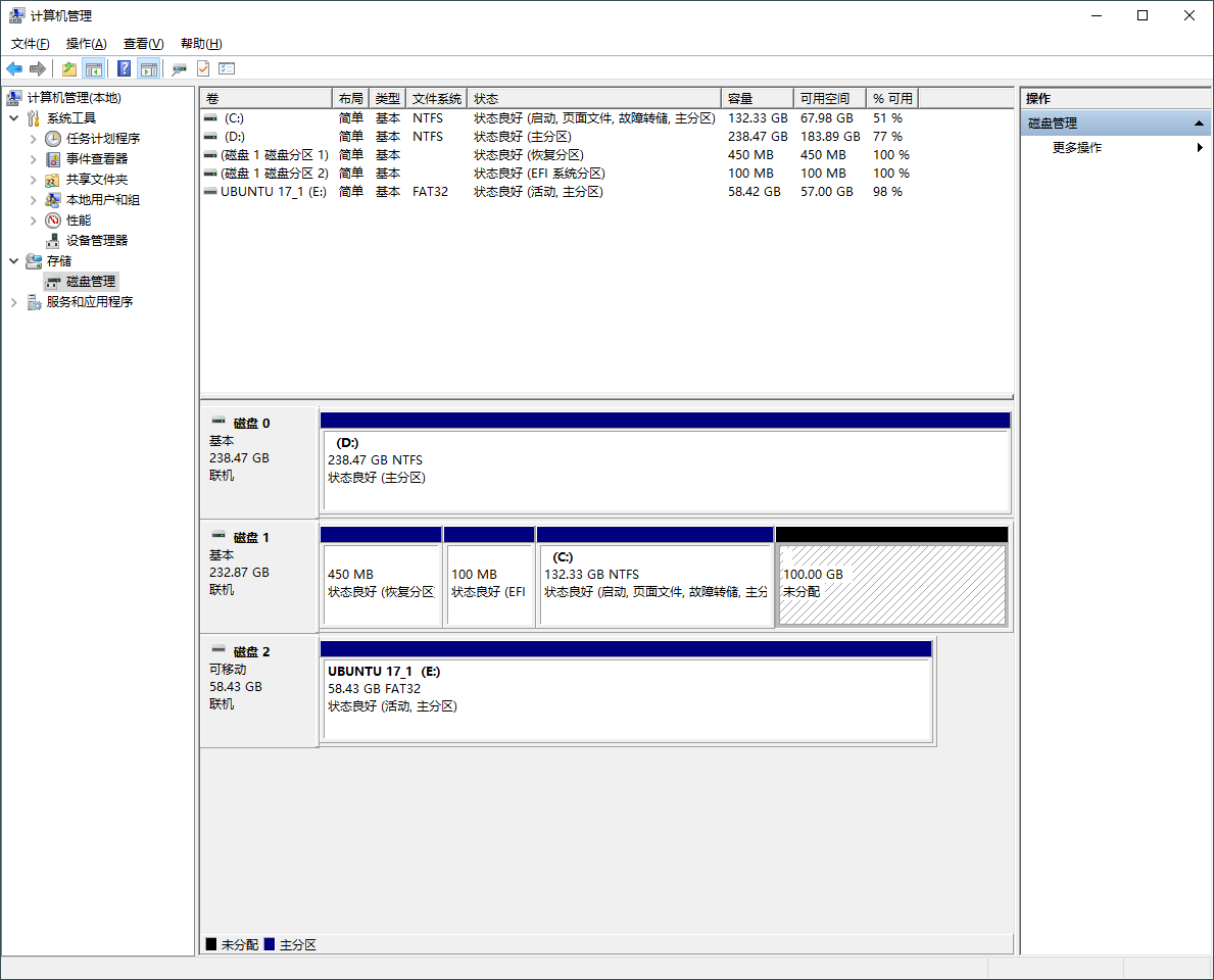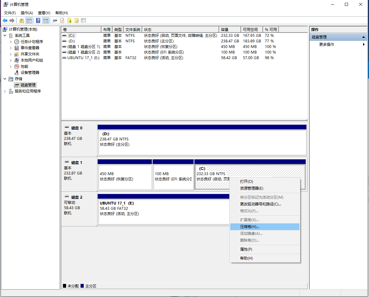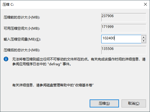 劃分你要分配給Ubuntu系統的空間,選擇壓縮,我在這里分配了100GiB
