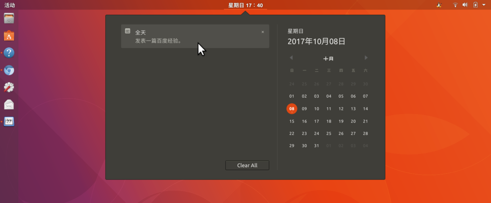 1、進入 Ubuntu 17.10 的桌面,其頂部面板條的中間,就是日歷控件。在不點擊的情況下,它顯示日期和時間;點擊展開后,它在左側顯示通知,在右側顯示日歷面板。