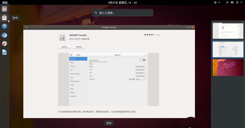 1、在“軟件”商店里,查找并安裝 Gnome Tweak 軟件,使用該軟件可以實(shí)現(xiàn)工作區(qū)動態(tài)、固定兩種模式的切換。