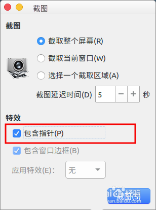 6、截圖的時候需要帶上鼠標,可以勾選“特效”下的“包含指針”。