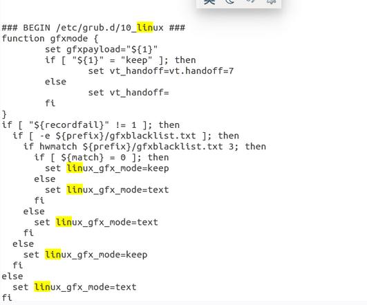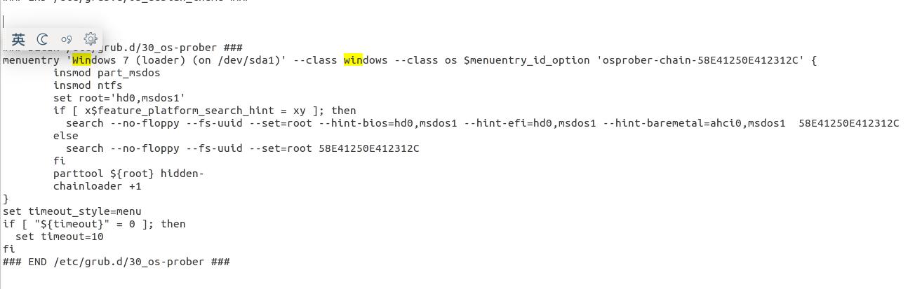 再輸入sudo gedit grub.cfg,打開grub.cfg文件后找到windows引導,如下圖所示,把他剪切出來