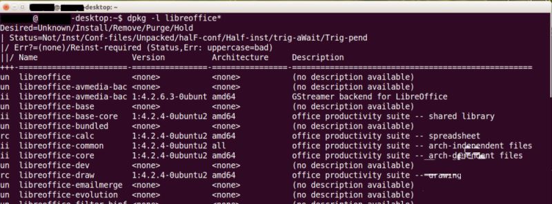 2、先列舉出libreoffice相關的軟件,看哪些是已經安裝的。命令為: dpkg -l libreoffice*