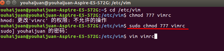 2、寫上sudo chmod 777 vimrc,回車,輸入密碼,回車,然后我們列出vimrc文件 再輸入vim vimrc回車