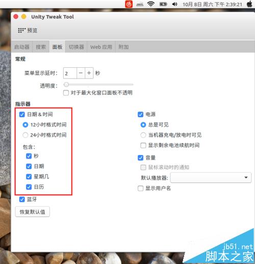 5、在指示器中選中“時間&日期”,里面可以添加顯示更詳細的時間,像秒、星期、以及時間用的12小時還是24小時格式。