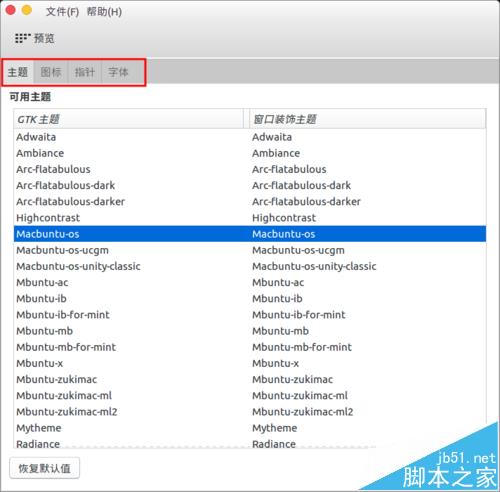 3、進入“主題”,可以設置主題,同樣可以設置圖標主題、鼠標主題、字體,需要更多主題可以自己安裝后來設置。