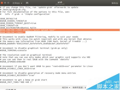 5、這里我們找到 GRUB_CMDLINE_LINUX=" ",然后把它改GRUB_CMDLINE_LINUX="text",如圖小編選中的位置。或者找到 GRUB_CMDLINE_LINUX_DEFAULT=”quiet splash”改成 GRUB_CMDLINE_LINUX_DEFAULT=”quiet splash text”