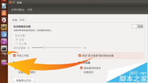 3、在與“外觀”并列的“行為”選項卡中,還有三項設置與啟動器有關,分別是:啟動器是否自動隱藏的開關;是否顯示“工作區”按鈕的開關;以及是否顯示“顯示桌面”按鈕的開關。可以根據需要開啟或關閉這些開關,以使啟動器的運行行為更符合自己的需要。