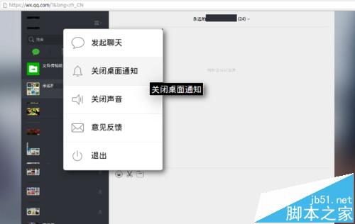 6、如果需要一直開著網頁版微信,但是需要階段性地排除微信消息干擾,可以關掉網頁版微信的消息提醒和聲音提示。在網頁版微信主窗口的漢堡菜單上單擊,在彈出的菜單上點擊執行“關閉桌面通知”和"關閉聲音“即可。