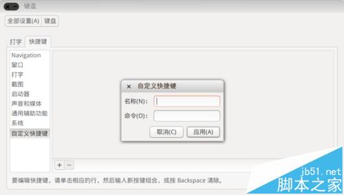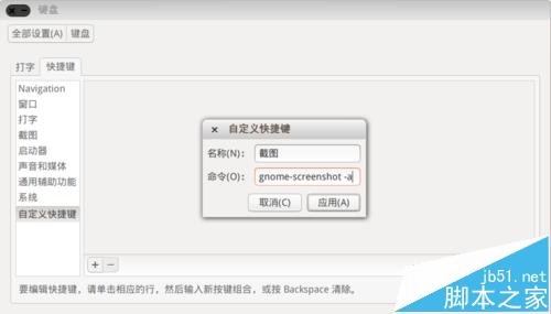 4、下面我們設置截圖的自定義快捷鍵。點擊"自定義快捷鍵",然后點擊加號按鈕添加快捷鍵,如圖,彈出對話框,輸入快捷方式的名稱和命令(參考上一步截圖命令的使用方法),例如設置區域截圖,命令里輸入”gnome-screenshot -a“后點擊”應用“即可。