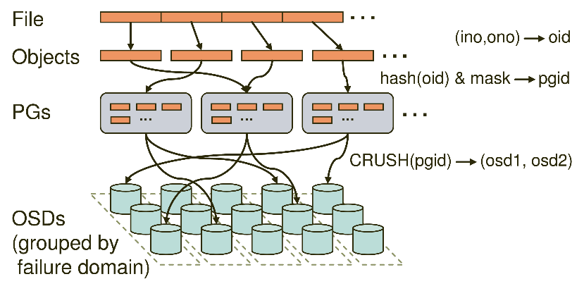(Pool, Object) → (Pool, PG) → OSD set → Disk