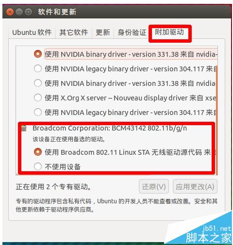 再打開“軟件和更新” 選擇 “附加驅動” 。 然后在網卡的那一欄,選擇使用你的網卡。點擊“應用更改”。(上面顯卡的驅動不要亂動啊,亂改的話,可能進不了系統。)
