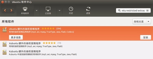 受限于法律限制 Ubuntu 無法直接集成 MP3 等流行的媒體編解碼器以讓用戶開箱即用,不過這個問題很好解決,我們可以直接在 Ubuntu 軟件中心中搜索 Ubuntu restricted extras 進行安裝。