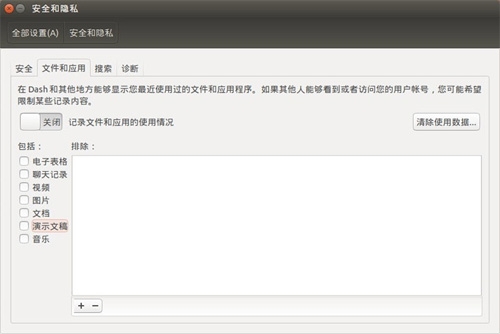 在系統設置—安全和隱私的文件和應用選擇卡中選擇關閉并去掉要禁止搜索結果中顯示的數據類型即可。如果不想在 Unity Dash 顯示在線搜索結果,只需在搜索選項卡中禁用在線搜索結果即可。
