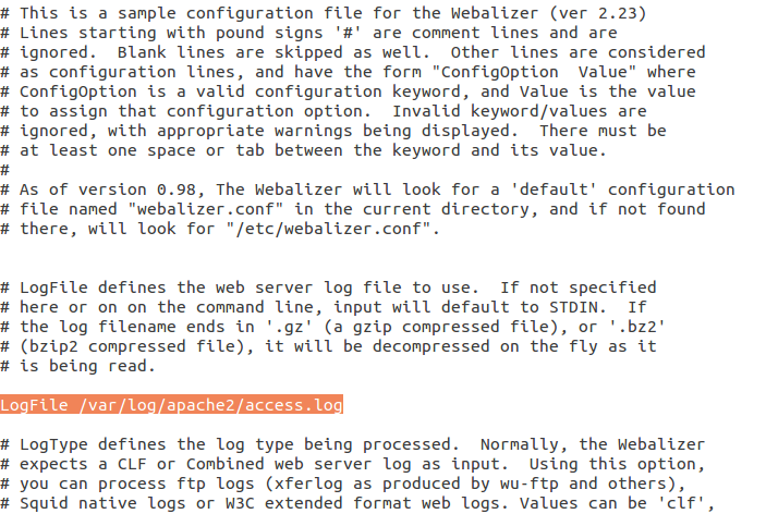 現在編輯Webalizer配置文件,為那里的Apache訪問日志糾正路徑。運行下面這個命令,即可使用Gedit編輯工具來編輯其配置文件。