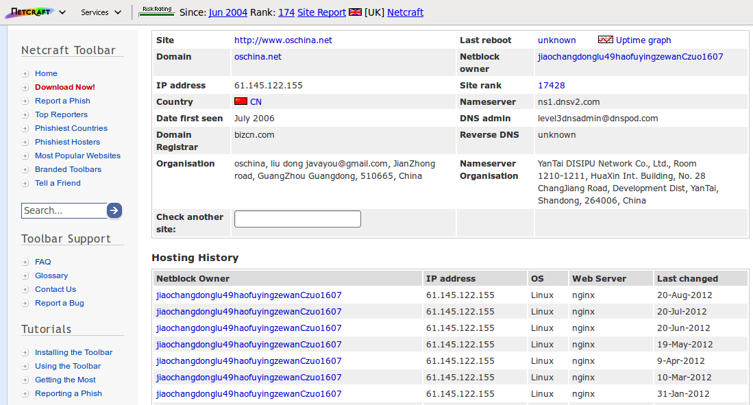 Firefox 裝個(gè) Netcraft Toolbar 已經(jīng)能滿足我們?nèi)粘W(wǎng)站服務(wù)器的簡單窺探,下面看看 Netcraft 對我們的 OSC 社區(qū)探測結(jié)果: