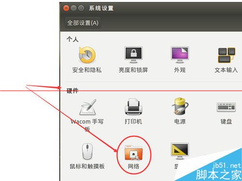 2、在系統設置頁面,找到【硬件】選項里面的【網絡】一項,然后再使用鼠標左鍵點擊打開它。