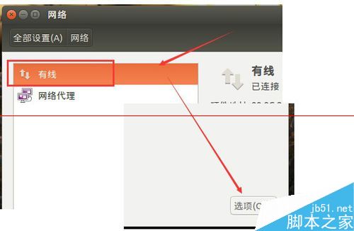 3、點開網絡頁面后,網絡頁面里面我們找到右下角的【選項】按鈕。這個按鈕點進去就能設置IP地址為靜態了。
