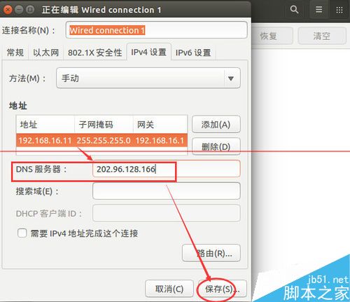 我們還需要給電腦設置一個DNS服務器地址。這里根據你所在地填寫,如果想要解析快,那么則需要填寫ping值比較小的DNS服務器地址。以上都填寫完成后,點擊【保存】按鈕。