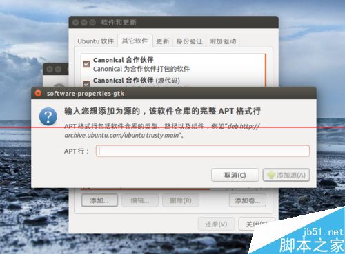 3、點擊下方的“添加”按鈕,接著就彈出一個添加軟件源的對話框。
