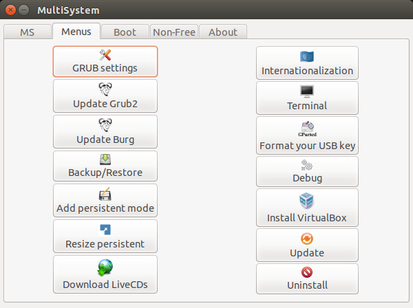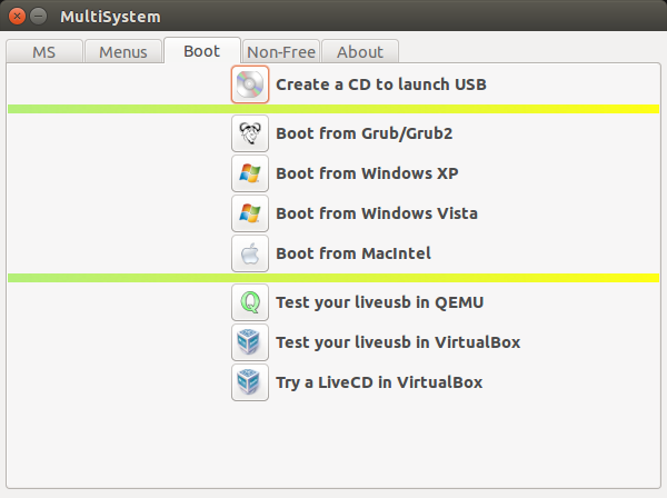 MultiSystem工具是我測試到現在最棒和最有用的一款工具。這款工具對那些想要在他們的機器上安裝多個系統的人是非常有用的。在你外出的時候,你不必再攜帶CD/DVD袋了。只要買一個16GB或者32GB的USB就行,并下載所有你想要的系統,隨心所欲的安裝系統即可。