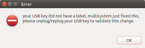 選擇USB設備,點擊確認按鈕。如果你看到下面的錯誤窗口,不必擔心,它說的是USB設備沒有標簽。點擊OK讓MultiSystem自動設置標簽。